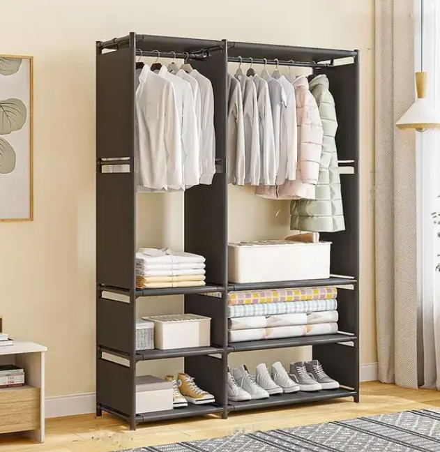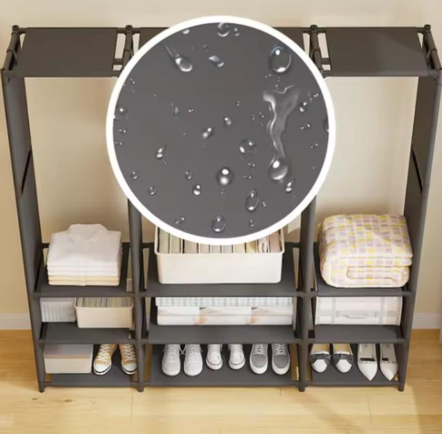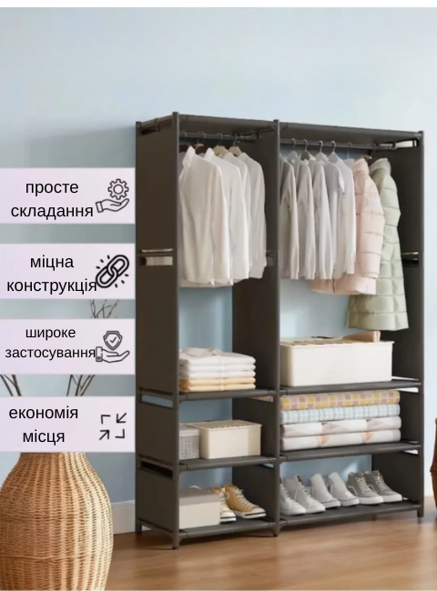 Конструкція поєднує зону для підвішування одягу та кілька містких полиць, що допомагає зберігати речі акуратно та впорядковано. Міцний металевий каркас забезпечує стабільність, а текстильні стінки додають легкості та сучасного вигляду.